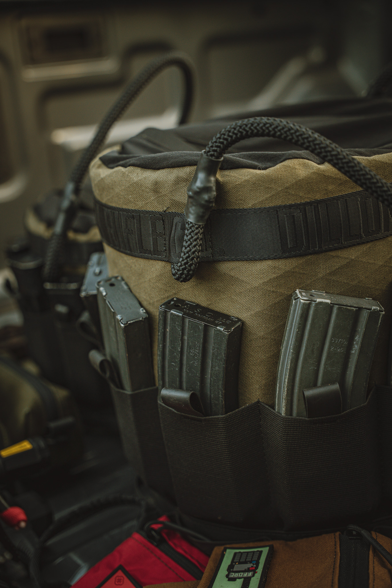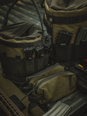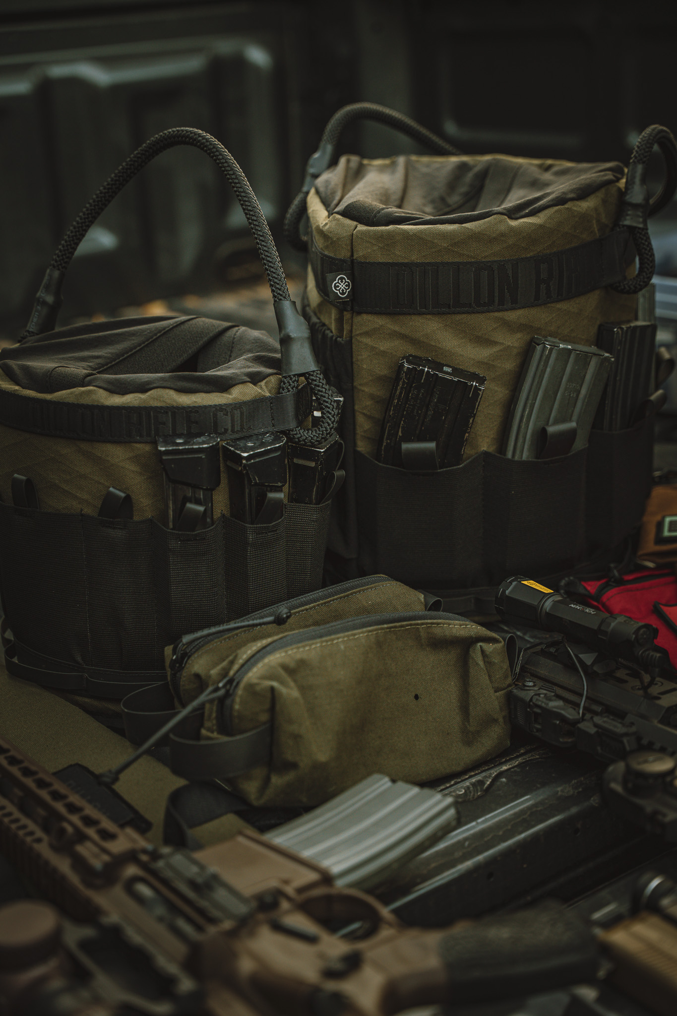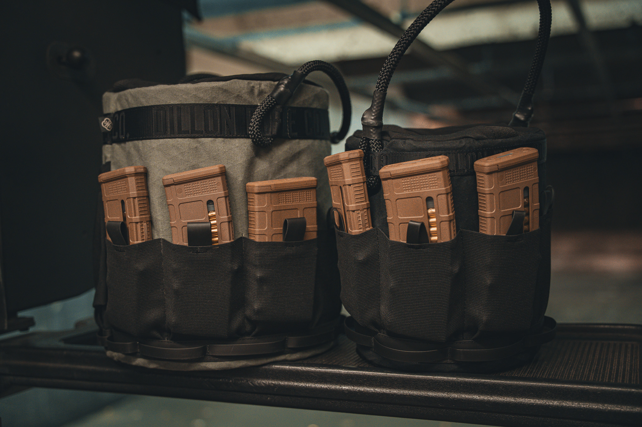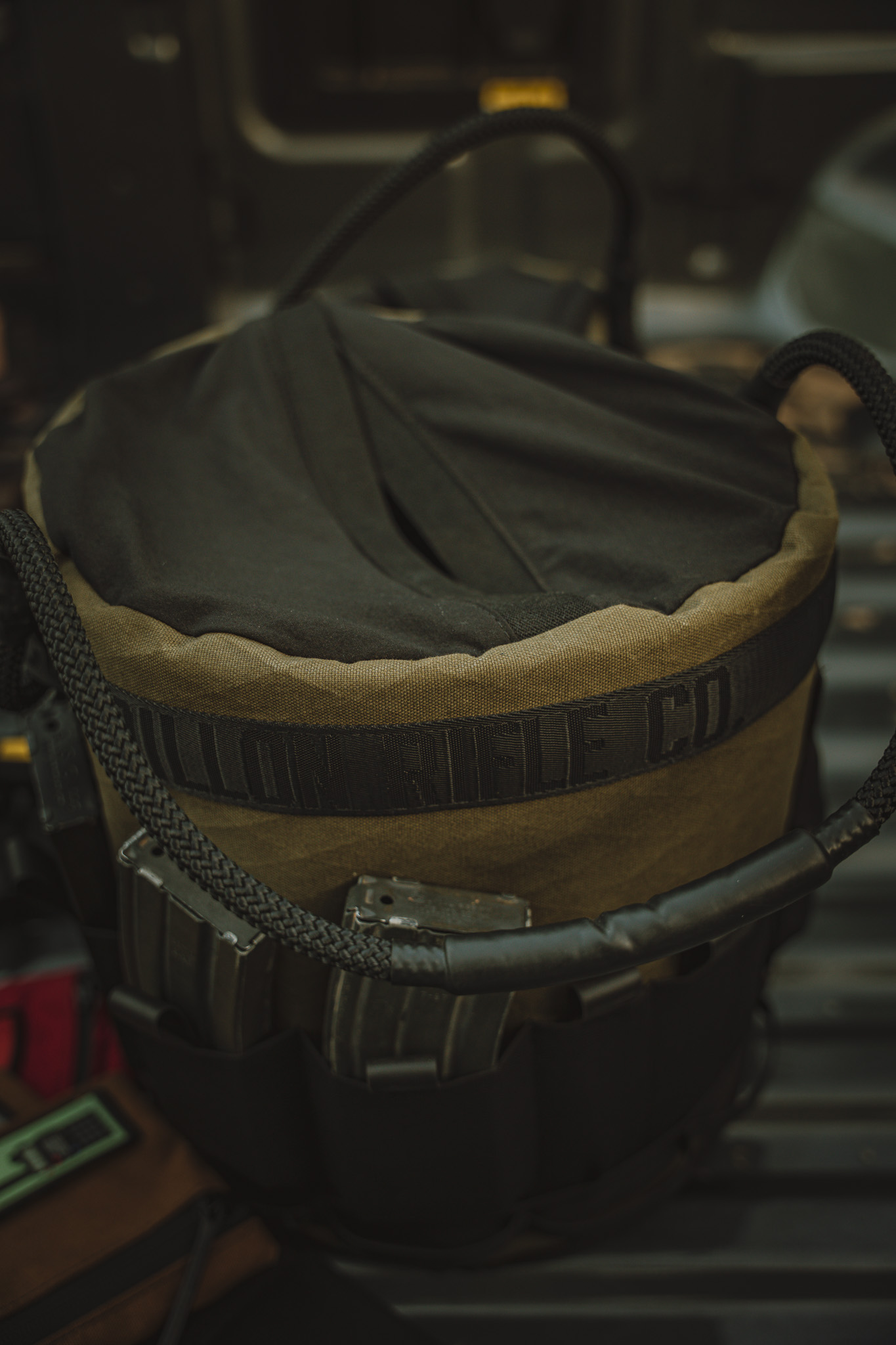 It features a high quality waterproof, laminated cotton exterior with a large side pocket to hold your eye and ear pro. The elastic outer band holds five 30-round AR mags and 3 pistol mags. It’s made with a soft (4-stretch nylon) top for easy access to drop empty mags inside and at the same time prevent it from spilling out. Also features coated webbing daisy chain around the base for multiple lashing points to secure your DRC Range Bucket anywhere. Topped off with a padded static line rope handle, you really can’t go wrong with this quality crafted product.
