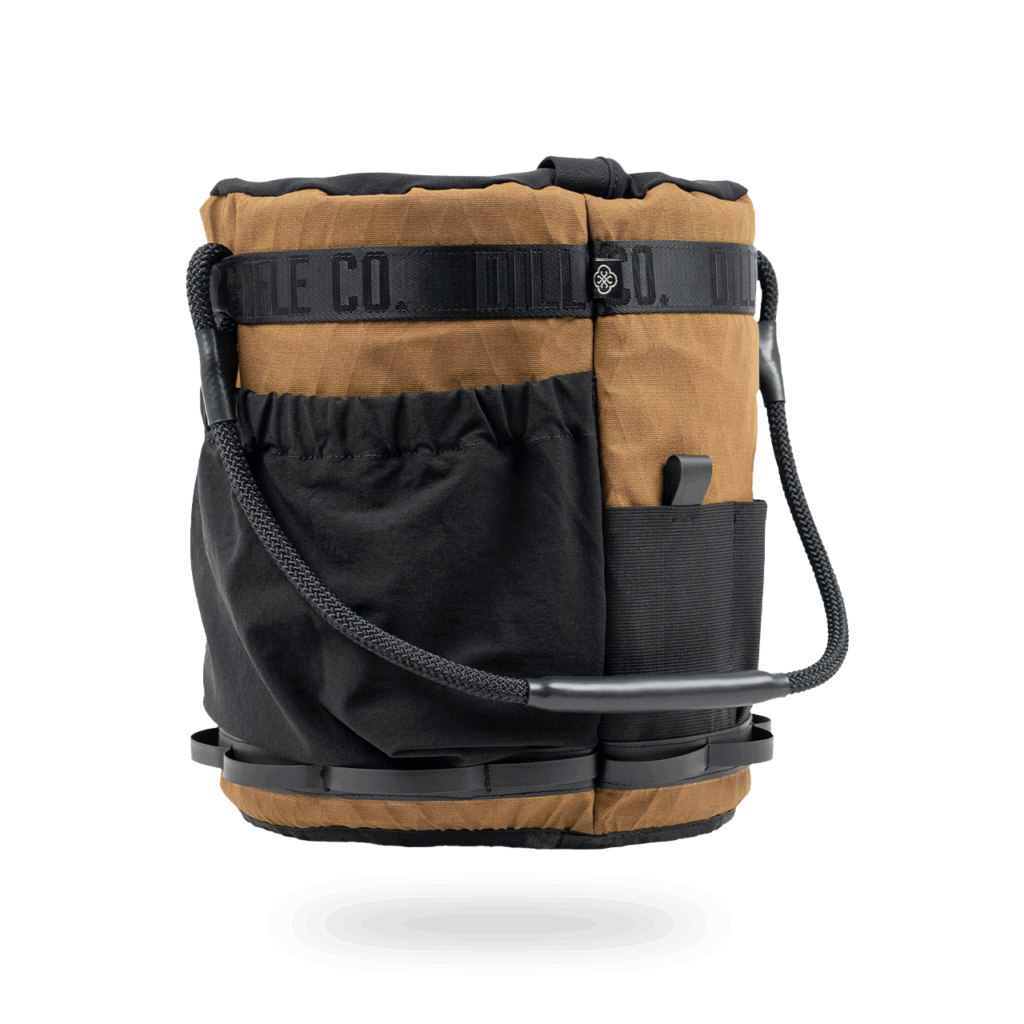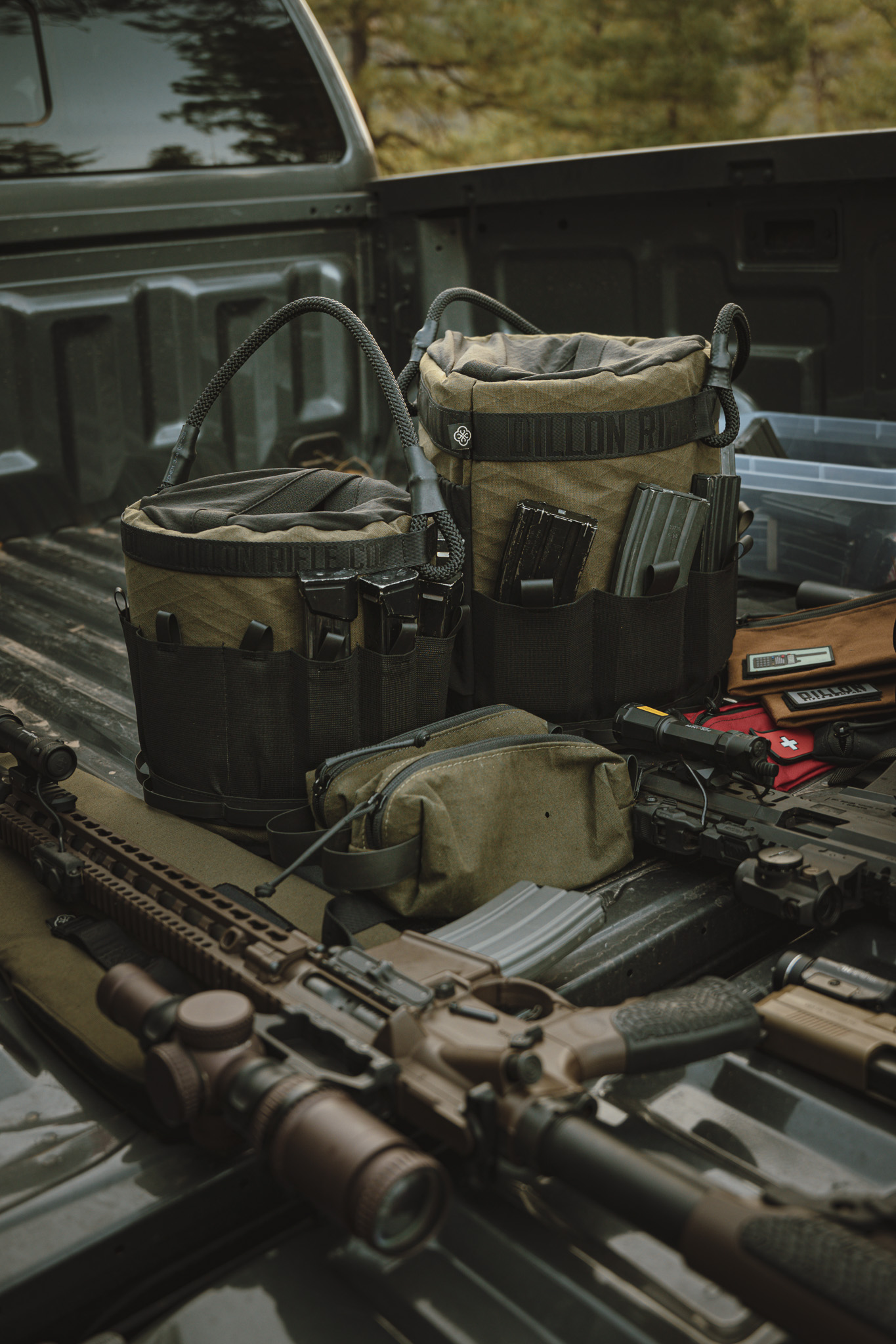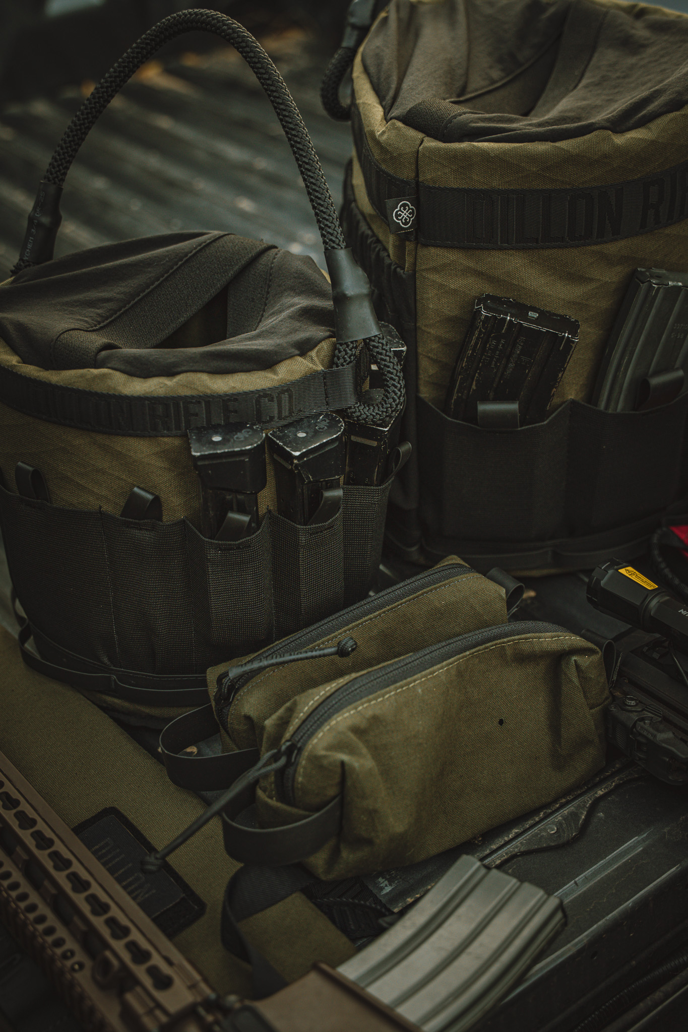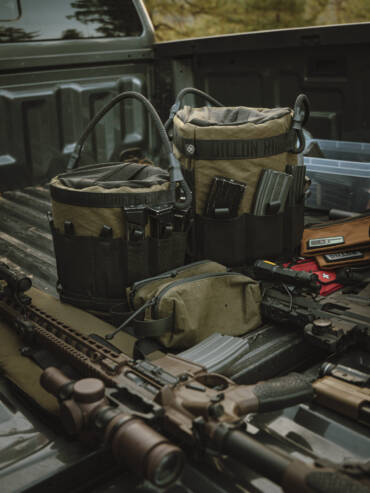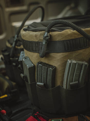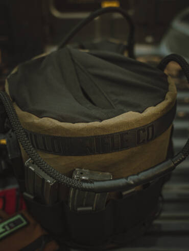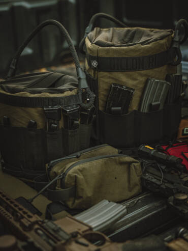 It features a high quality waterproof, laminated cotton exterior with a large side pocket to hold your eye and ear pro. The elastic outer band holds five 30-round AR mags and 3 pistol mags. It’s made with a soft (4-stretch nylon) top for easy access to drop empty mags inside and at the same time prevent it from spilling out. Also features coated webbing daisy chain around the base for multiple lashing points to secure your DRC Range Bucket anywhere. Topped off with a padded static line rope handle, you really can’t go wrong with this quality crafted product.