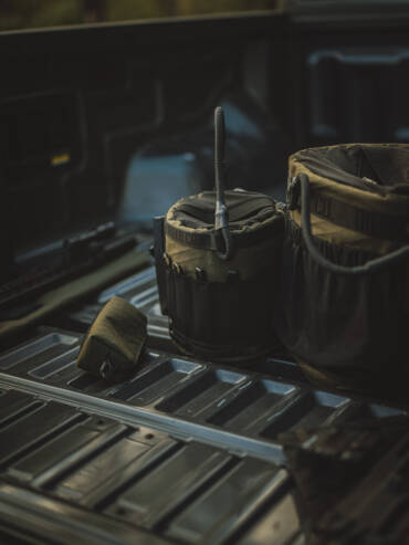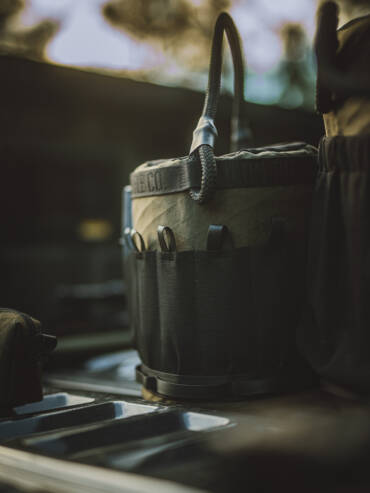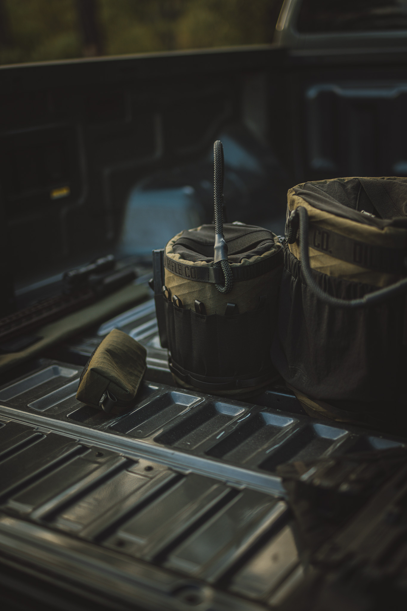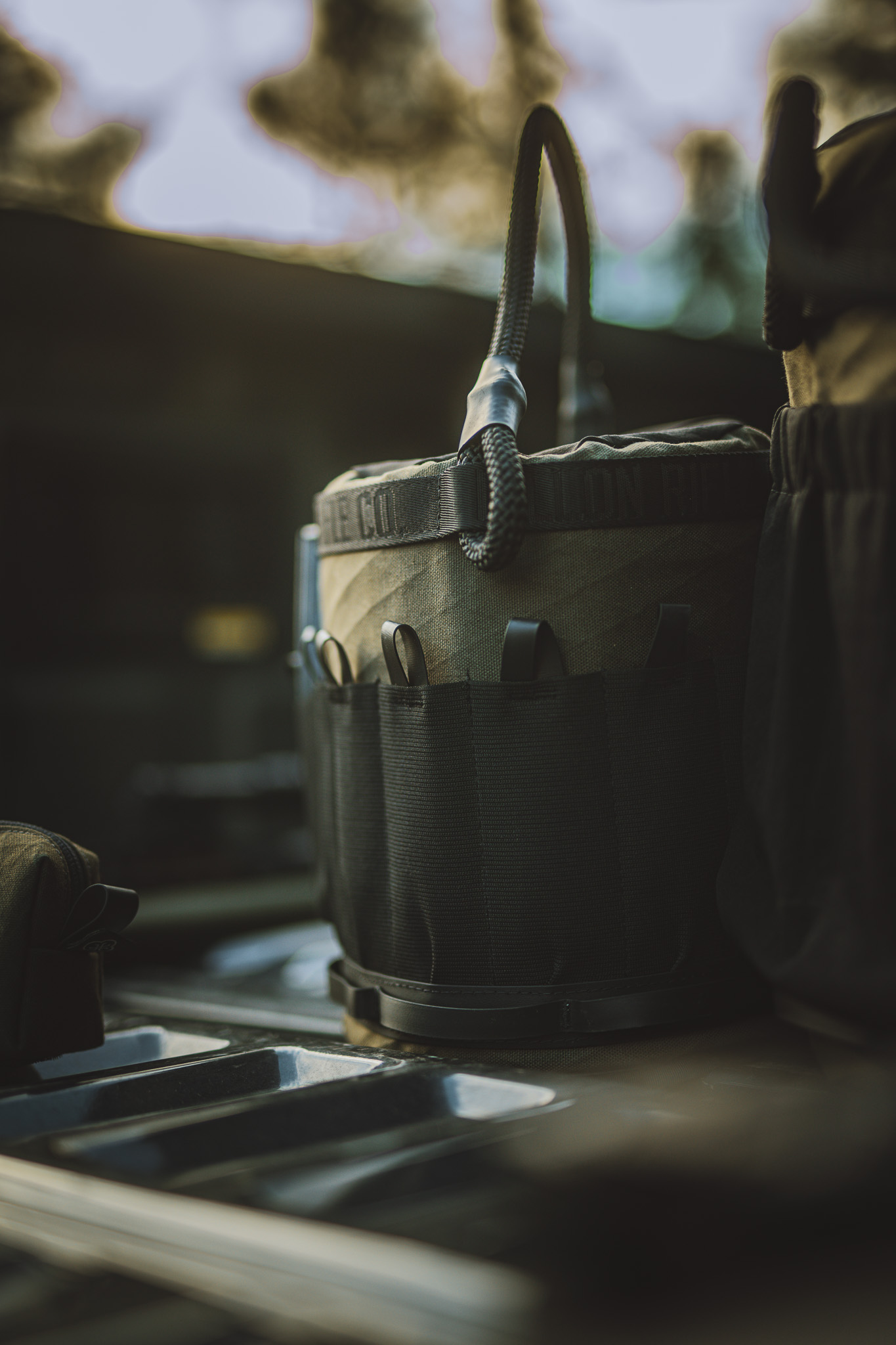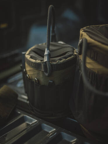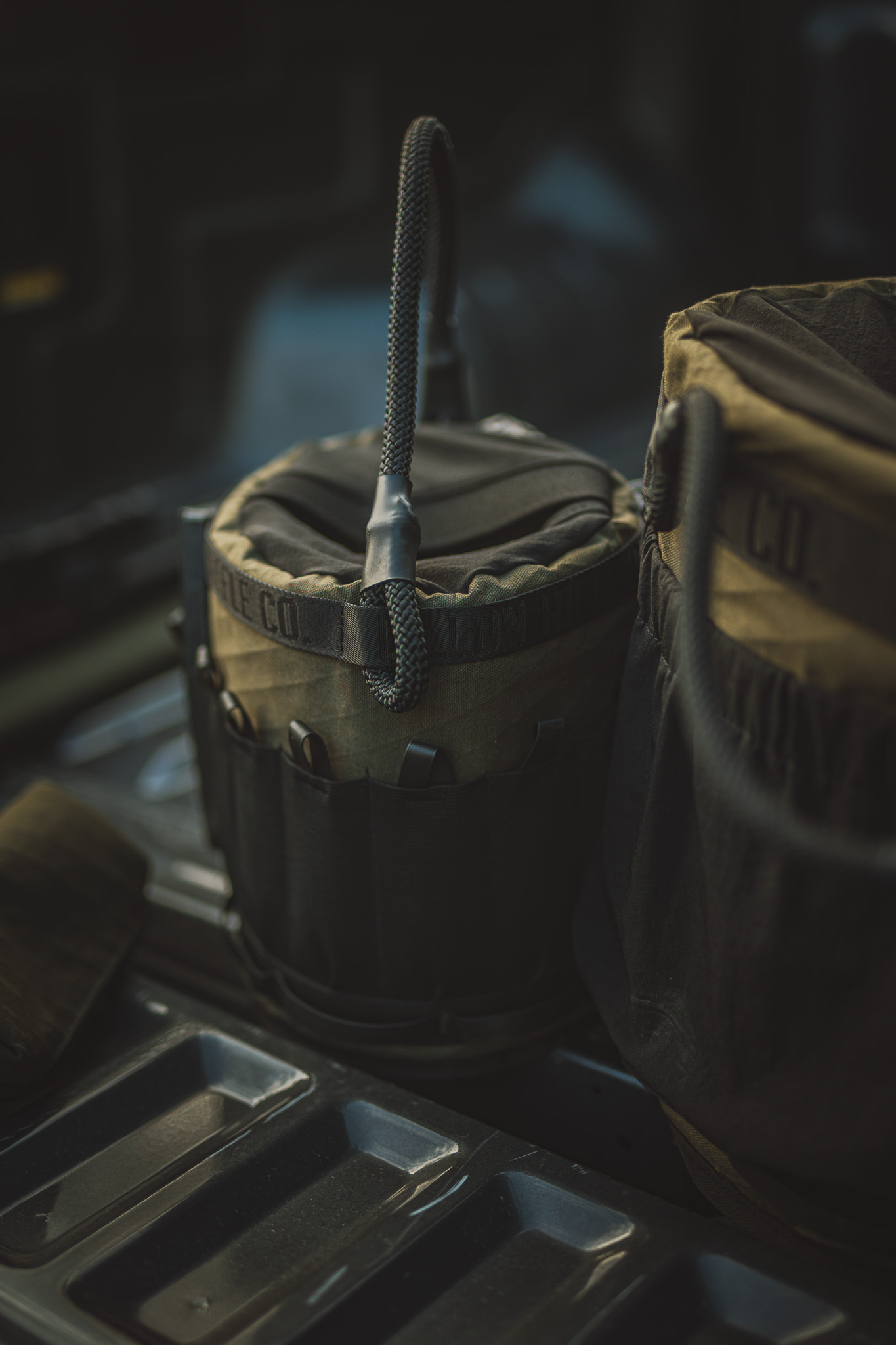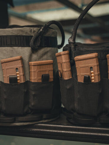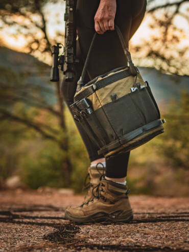 It features a high quality waterproof, laminated cotton exterior with a large side pocket to hold your eye and ear pro. The elastic outer band holds five 30-round AR mags and 3 pistol mags. It’s made with a soft (4-stretch nylon) top for easy access to drop empty mags inside and at the same time prevent it from spilling out. Also features coated webbing daisy chain around the base for multiple lashing points to secure your DRC Range Bucket anywhere. Topped off with a padded static line rope handle, you really can’t go wrong with this quality crafted product.